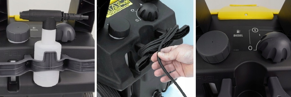 Urządzenie zaprojektowano mając na względzie wygodę użytkownika, o czym świadczą uchwyty na lancę i pistolet, rączka do transportu oraz funkcja pozycji parking.