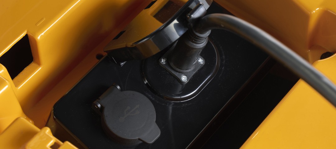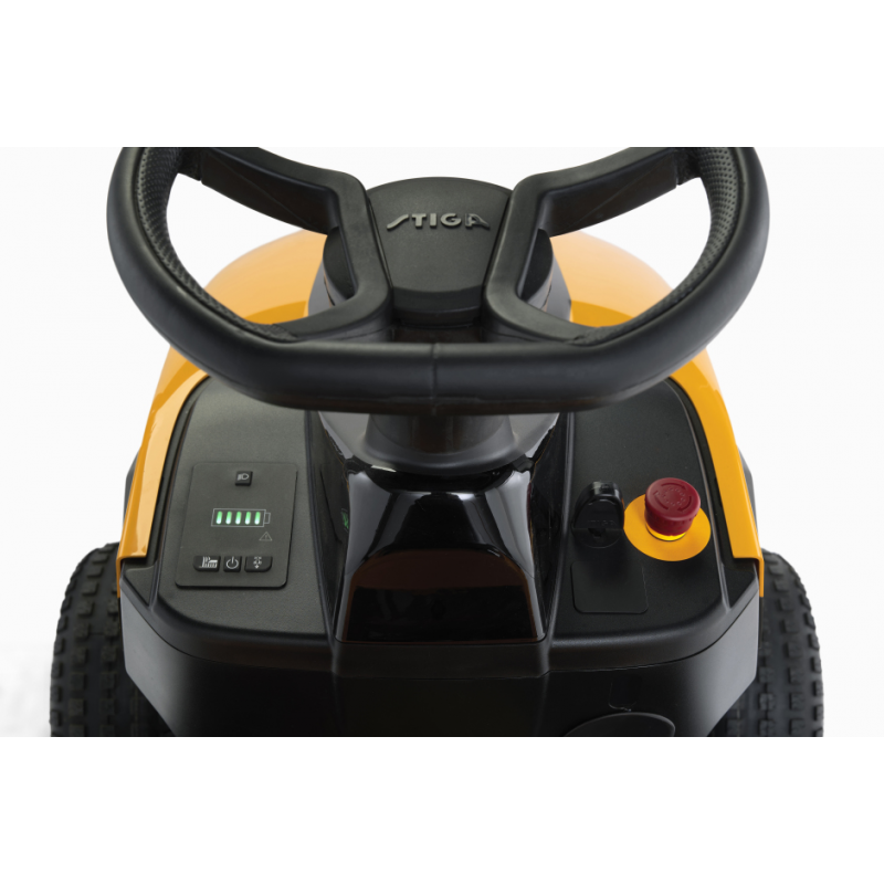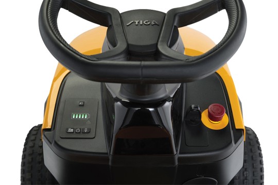 Stiga Estate 384e wyposażona w konsole na desce rozdzielczej, która zawiera przycisk start, stan baterii, alarm LED oraz wtyczkę USB.