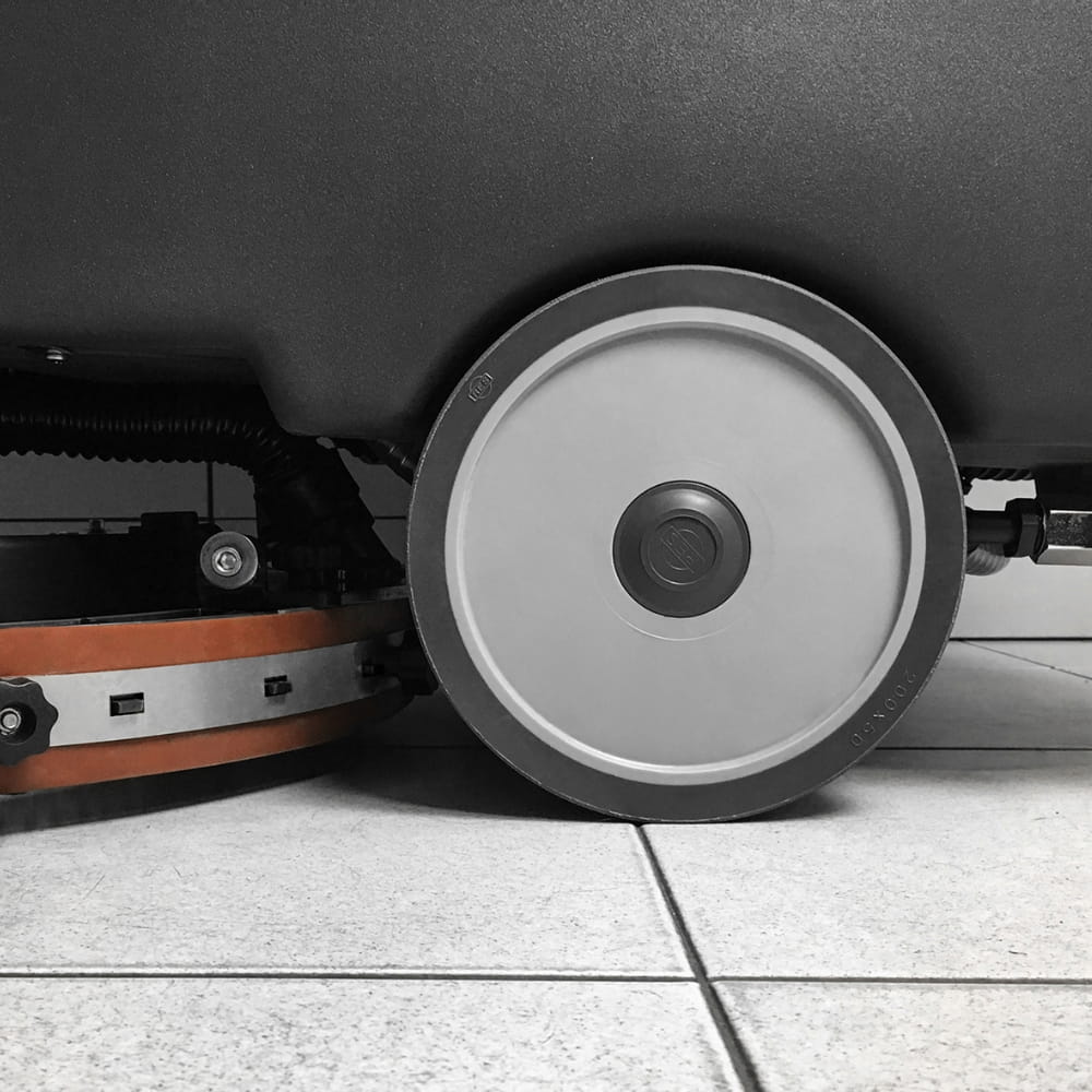 - Bezśladowe koła - koła szorowarki nie pozostawiają śladów na podłodze, dzięki czemu podłoga pozostaje czysta i estetyczna.