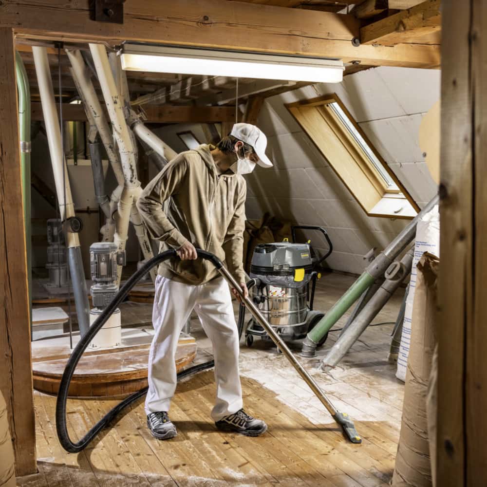 Jego konstrukcja, w pełni uziemiona i wyposażona w odpowiednie akcesoria przewodzące prąd, skutecznie zapobiega wyładowaniom elektrostatycznym. Odkurzacz posiada 75-litrowy pojemnik ze stali nierdzewnej oraz solidne podwozie z regulowanym uchwytem, co ułatwia usuwanie dużych ilości zanieczyszczeń. Model NT 75/1 Me Ec M Z22 wyposażony jest w płaski filtr falisty klasy M, który zapewnia efektywne zatrzymywanie pyłu na poziomie 99,9% i sprawdza się zarówno w pracy na mokro, jak i sucho. Urządzenie może być używane bez worka filtracyjnego lub worka na odpady – w takim przypadku można zastosować opcjonalny filtr kartridżowy do drewna, zaprojektowany do odkurzania włóknistych zanieczyszczeń bez użycia worka filtracyjnego.