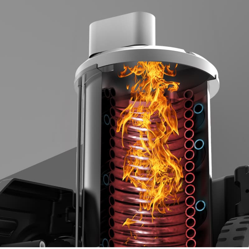 - Pionowy kocioł ze stalową wężownicą: zwiększa efektywność cieplną i trwałość urządzenia.