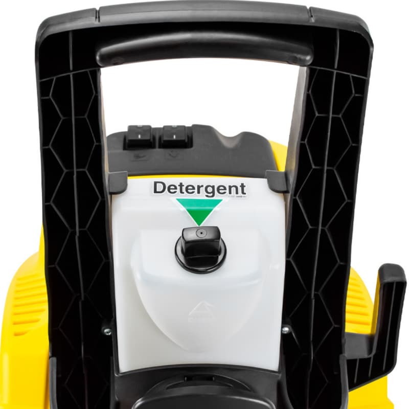 - Ergonomiczny uchwyt z zasobnikiem na detergent: ułatwia operowanie myjką i pozwala na łatwe aplikowanie środków czyszczących.