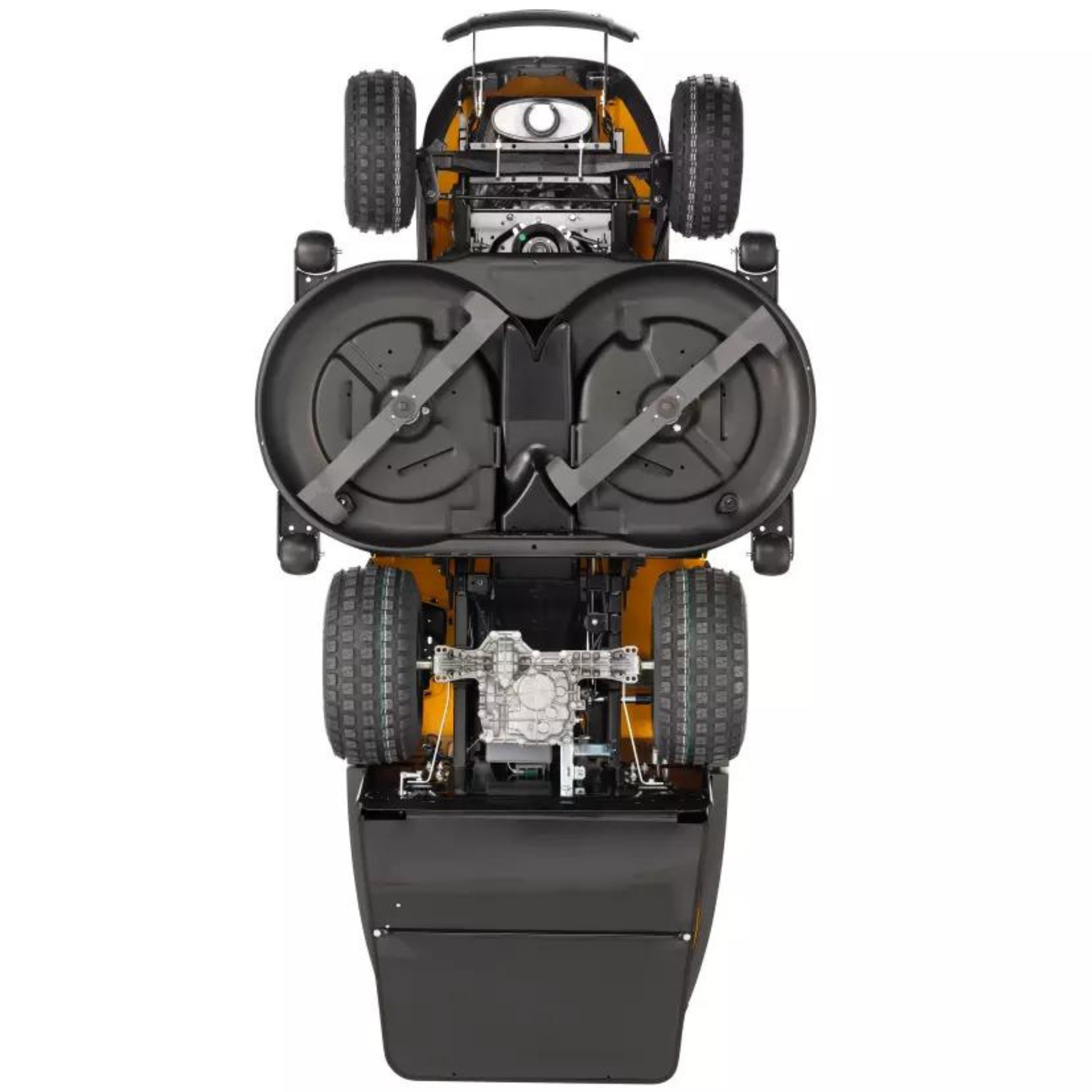 Agregat tnący ma dużą szerokość 122 cm i jest wyposażony w dwa zsynchronizowane ostrza, które optymalizują wydajność zbierania trawy. Włączenie noży jest elektromagnetyczne, a wysokość koszenia możesz wybrać spośród siedmiu różnych pozycji.